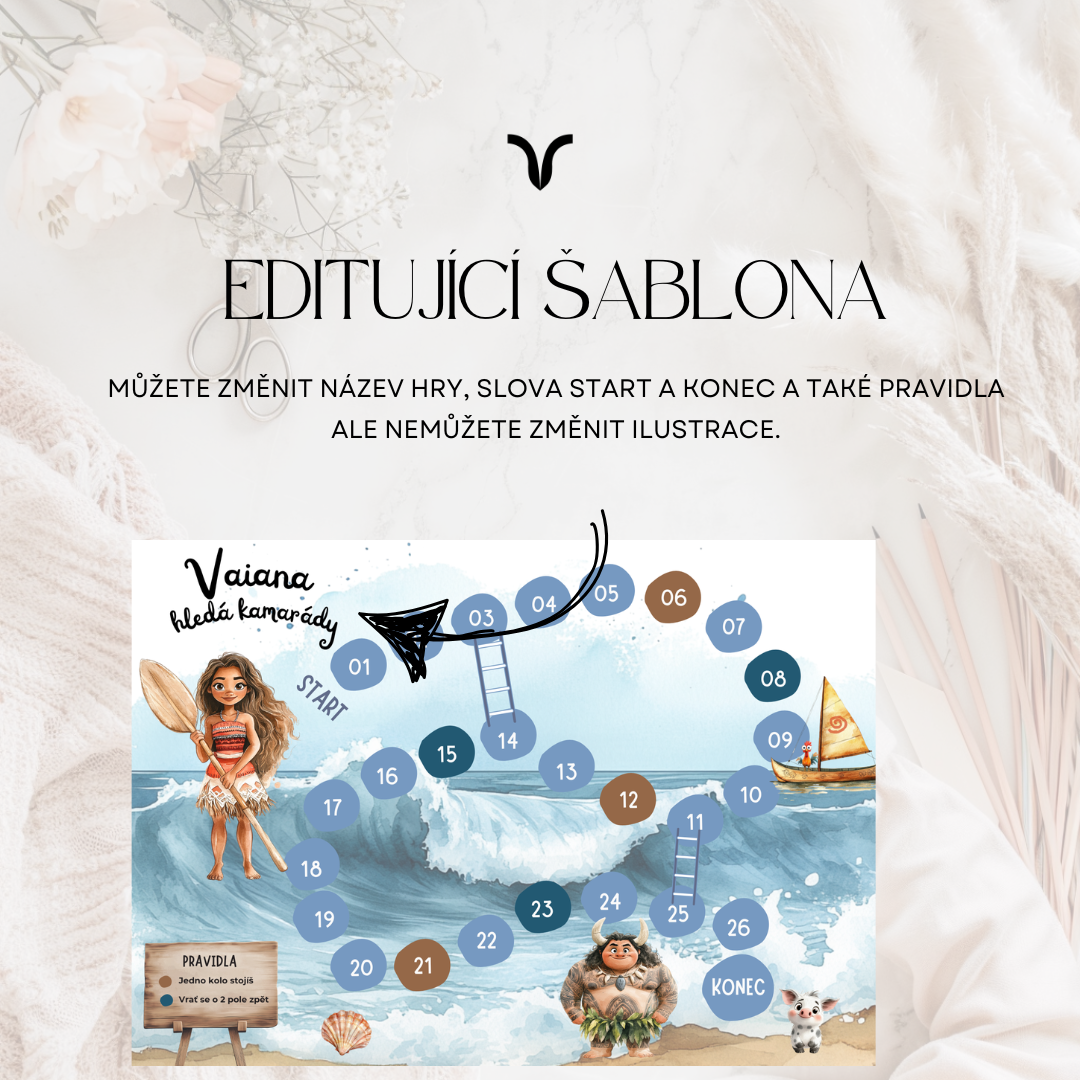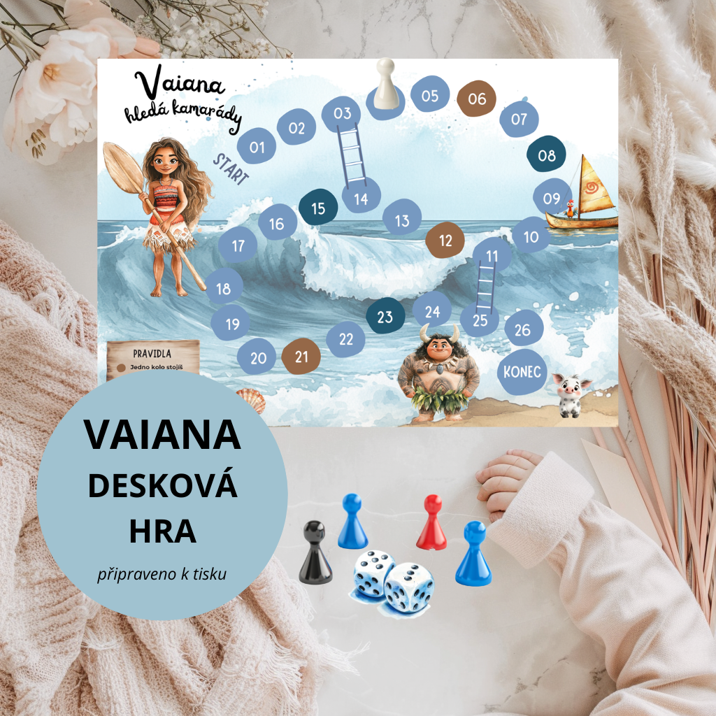 Přeneste kouzlo oceánu do svého herního odpoledne s touto deskovou hrou inspirovanou oblíbenou pohádkou Moana (Vaiana)! Tato zábavná tisknutelná hra je ideální pro děti, narozeninové oslavy, rodinné chvíle nebo deštivé dny doma. Stačí stáhnout, vytisknout a hrát!