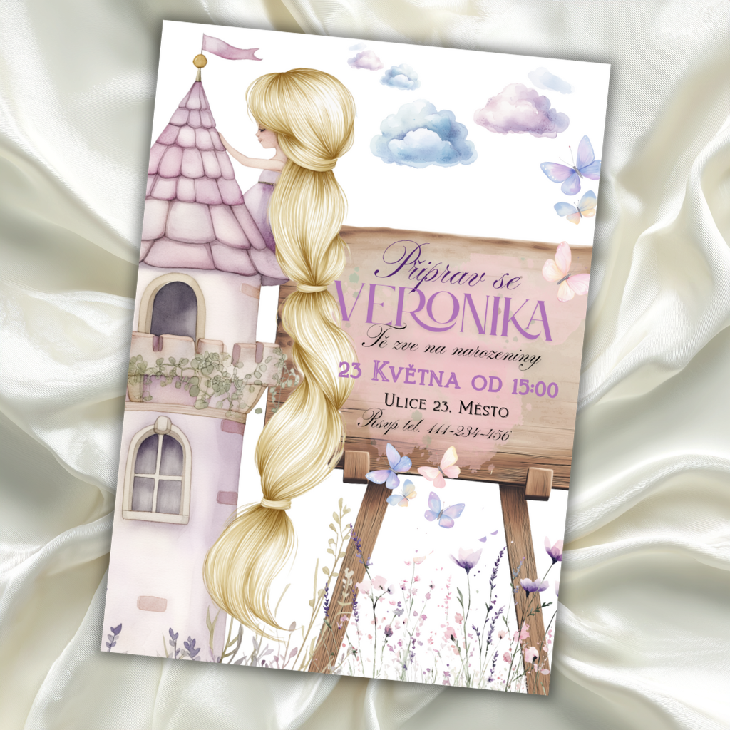 Tato něžná digitální pozvánka s akvarelovou ilustrací věže, ve které sedí princezna s dlouhými zlatými vlasy na parapetu, okouzlí každou malou milovnici pohádkových příběhů. Ilustrace je laděná do jemných pastelových barev a působí snově a přívětivě.