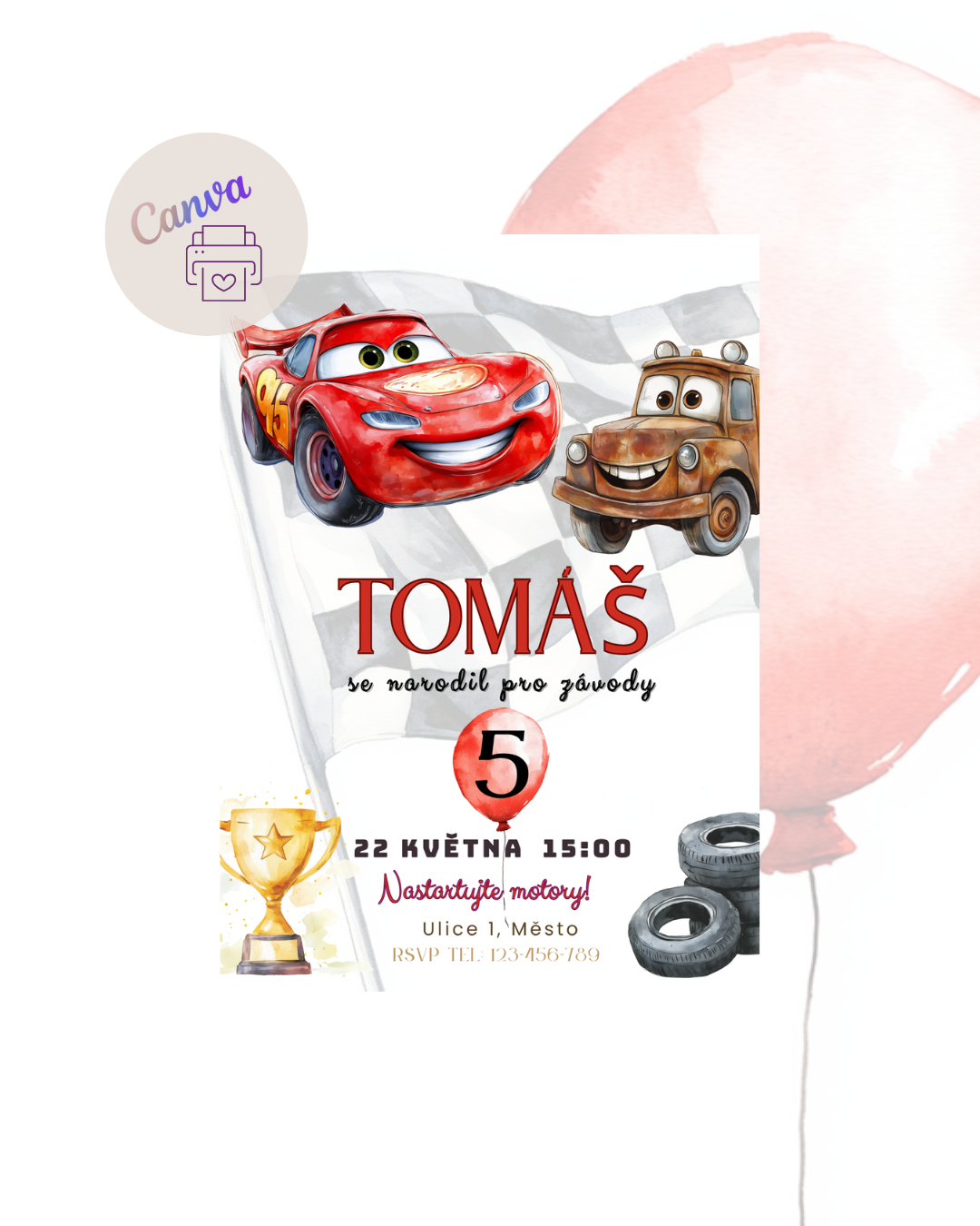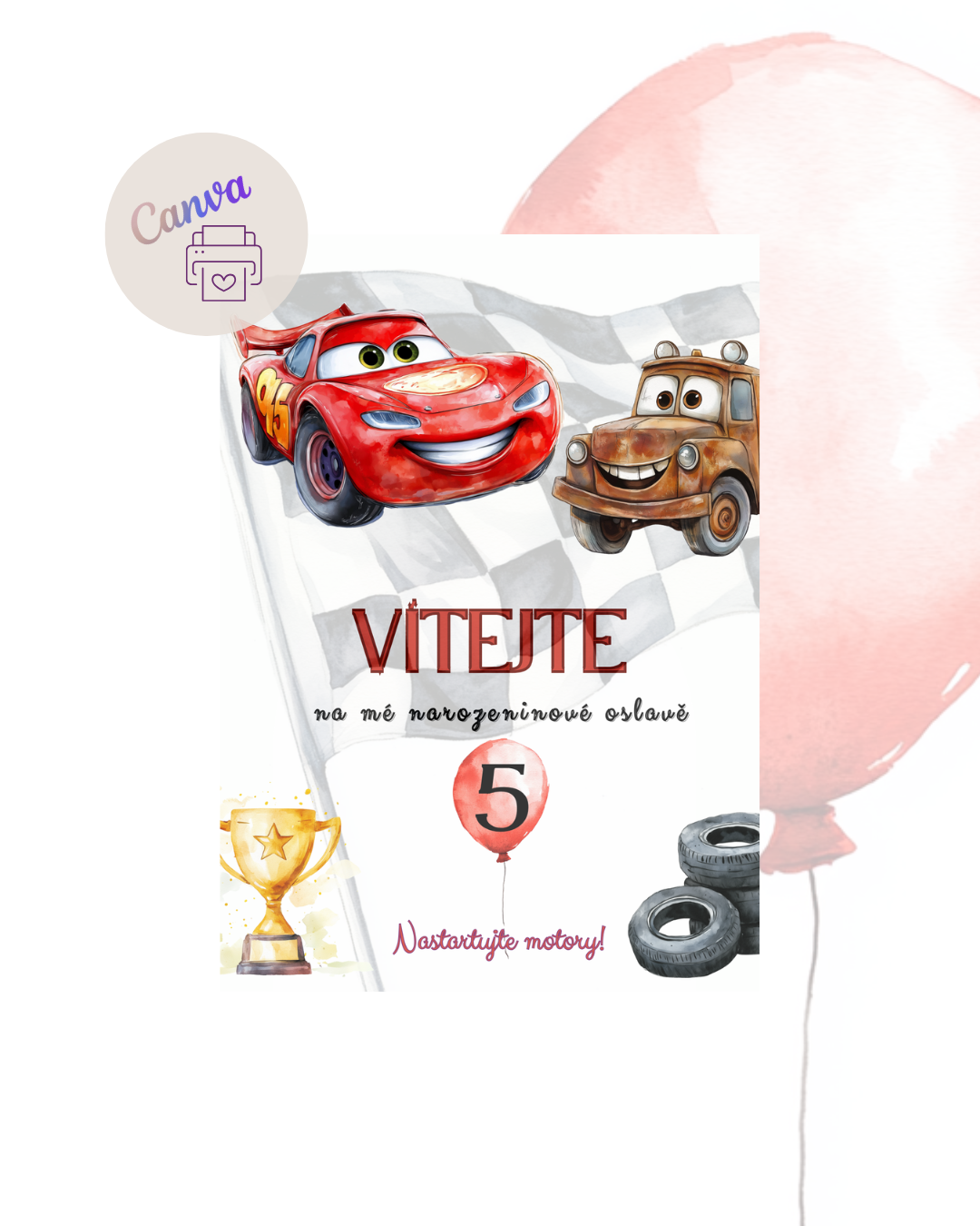 Digitální pozvánka s motivem oblíbených hrdinů z filmu Auta – Blesk McQueen, Burák jsou připraveni vyrazit na narozeninovou jízdu!