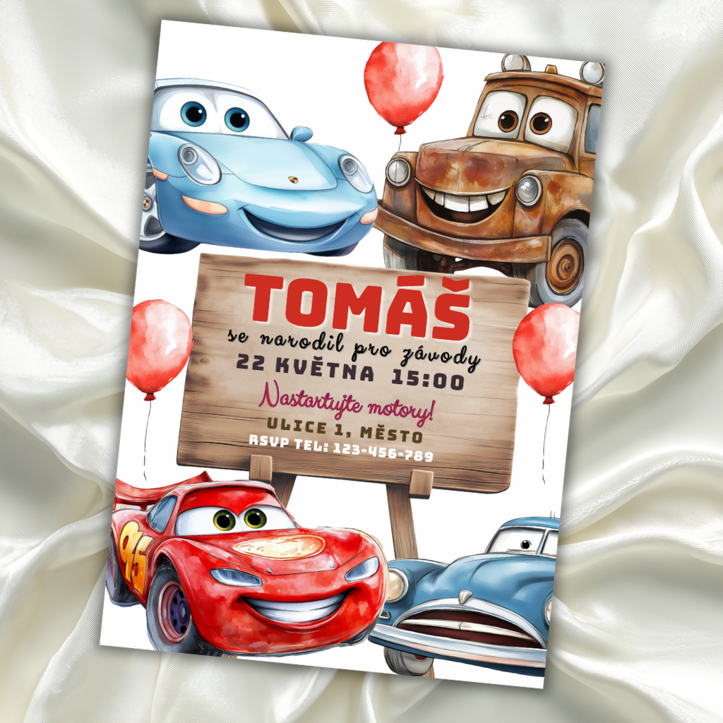 Digitální pozvánka s motivem oblíbených hrdinů z filmu Auta – Blesk McQueen, Burák, Sally i Doktor Hudson jsou připraveni vyrazit na narozeninovou jízdu!
