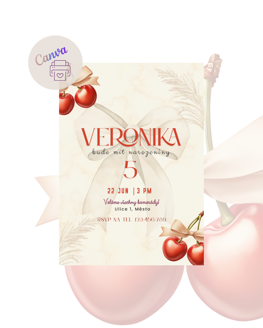 Digitální narozeninová pozvánka v retro stylu s třešničkou a mašličkou