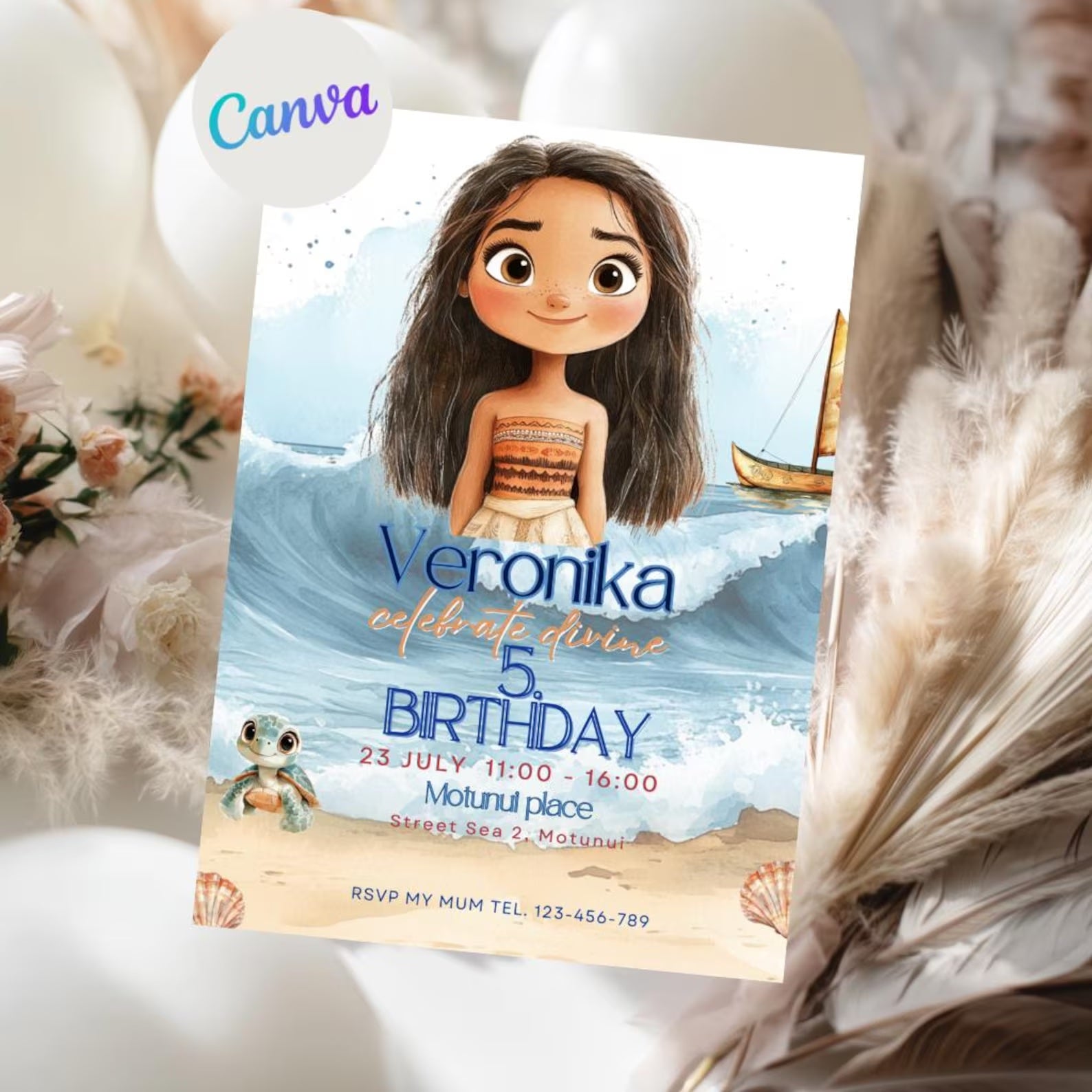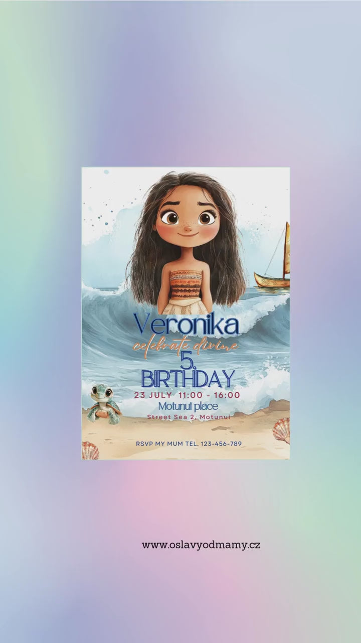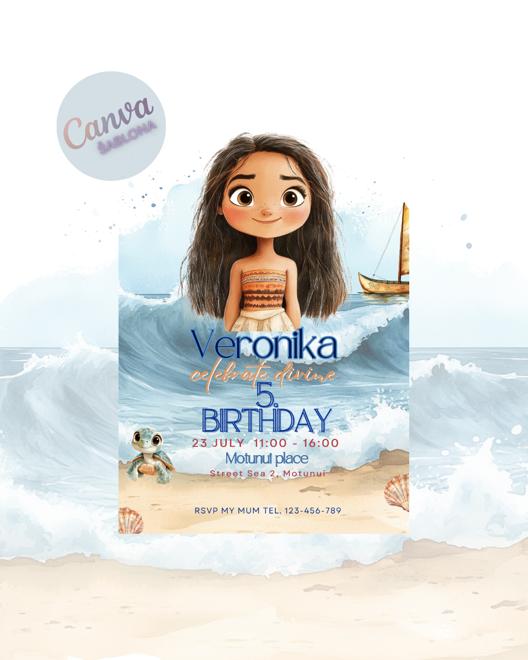 Tato digitální pozvánka inspirovaná odvážnou Moanou (Vaianou) a magií oceánu je jako stvořená pro malé duše, které touží objevovat svět, tančit na pláži a věřit, že všechno je možné.