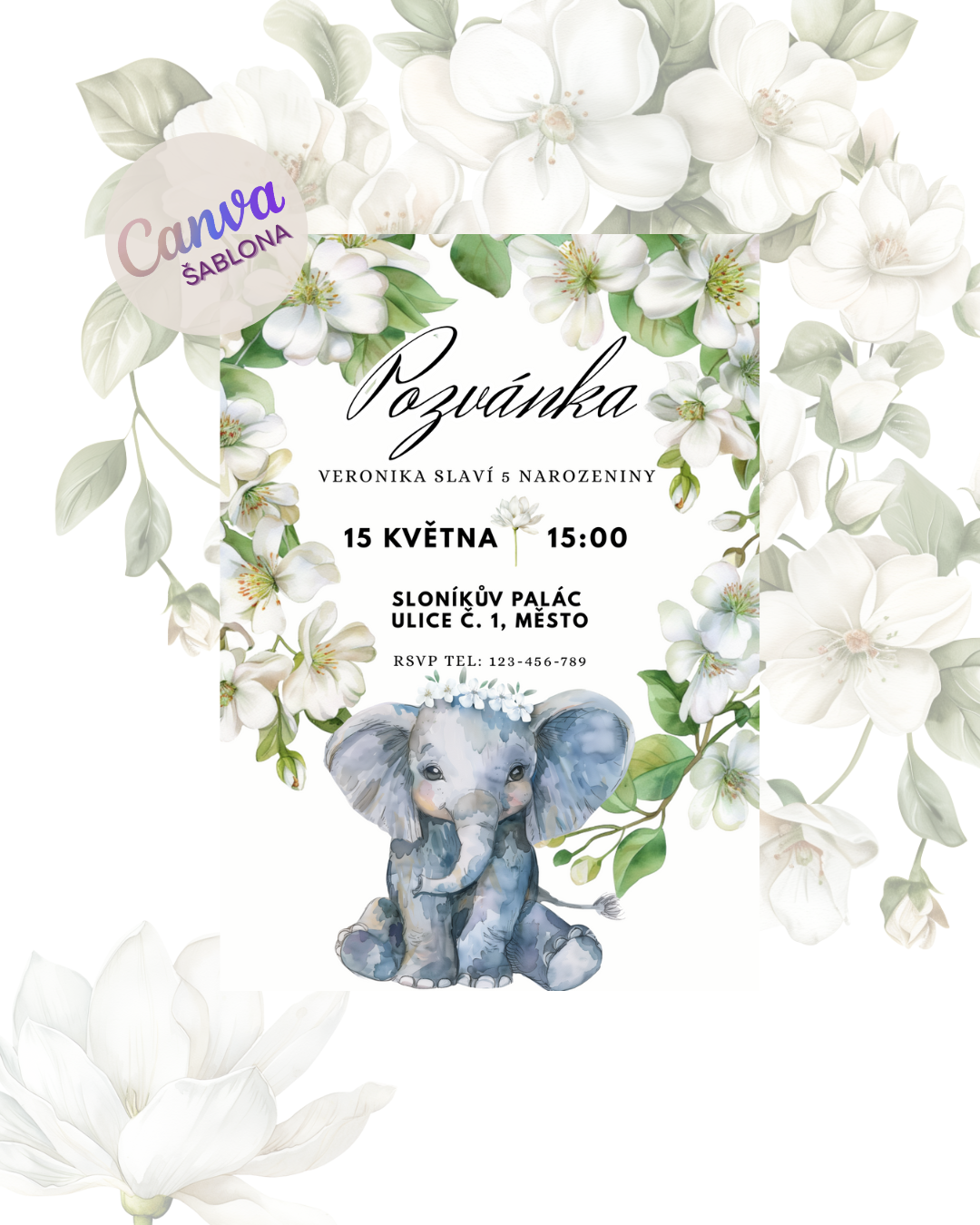 Digitální pozvánka – Roztomilý sloník s květinami💙