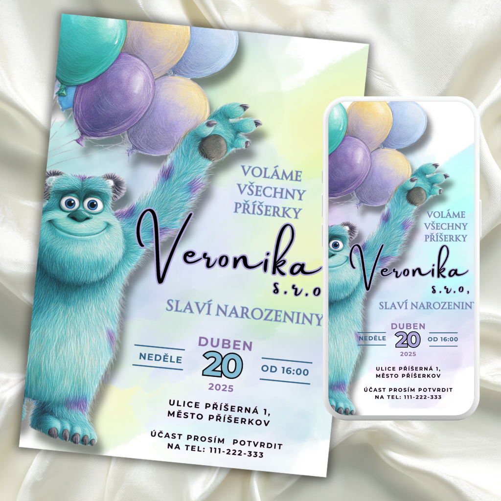 Digitální šablona narozeninové pozvánky - inspirována pohádkou Příšerky s.r.o.
