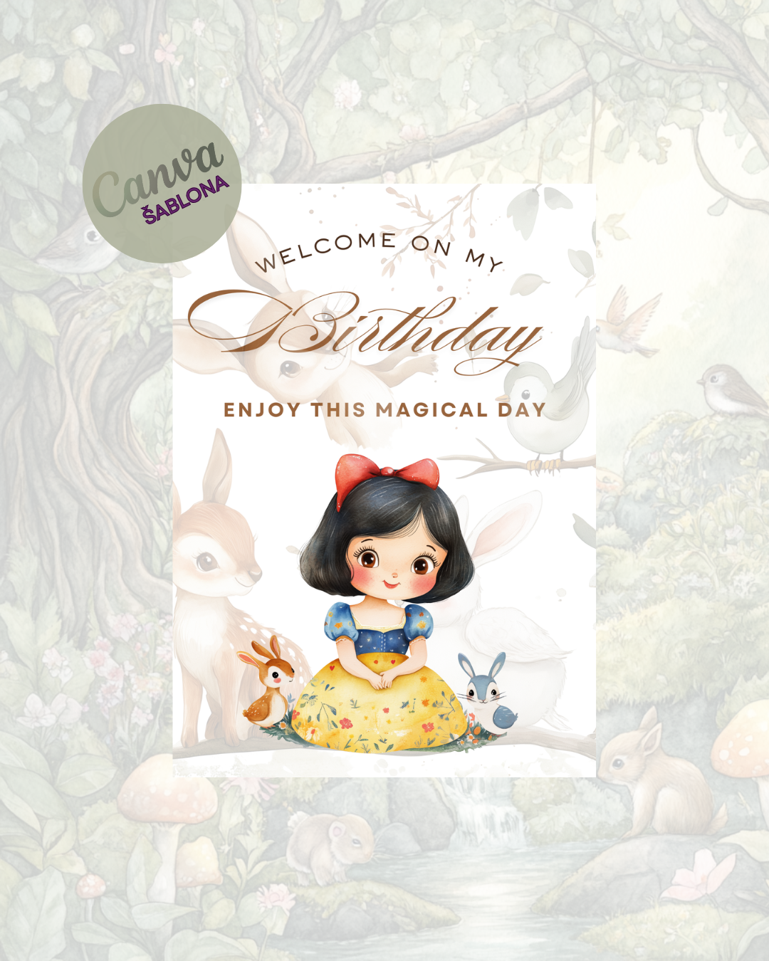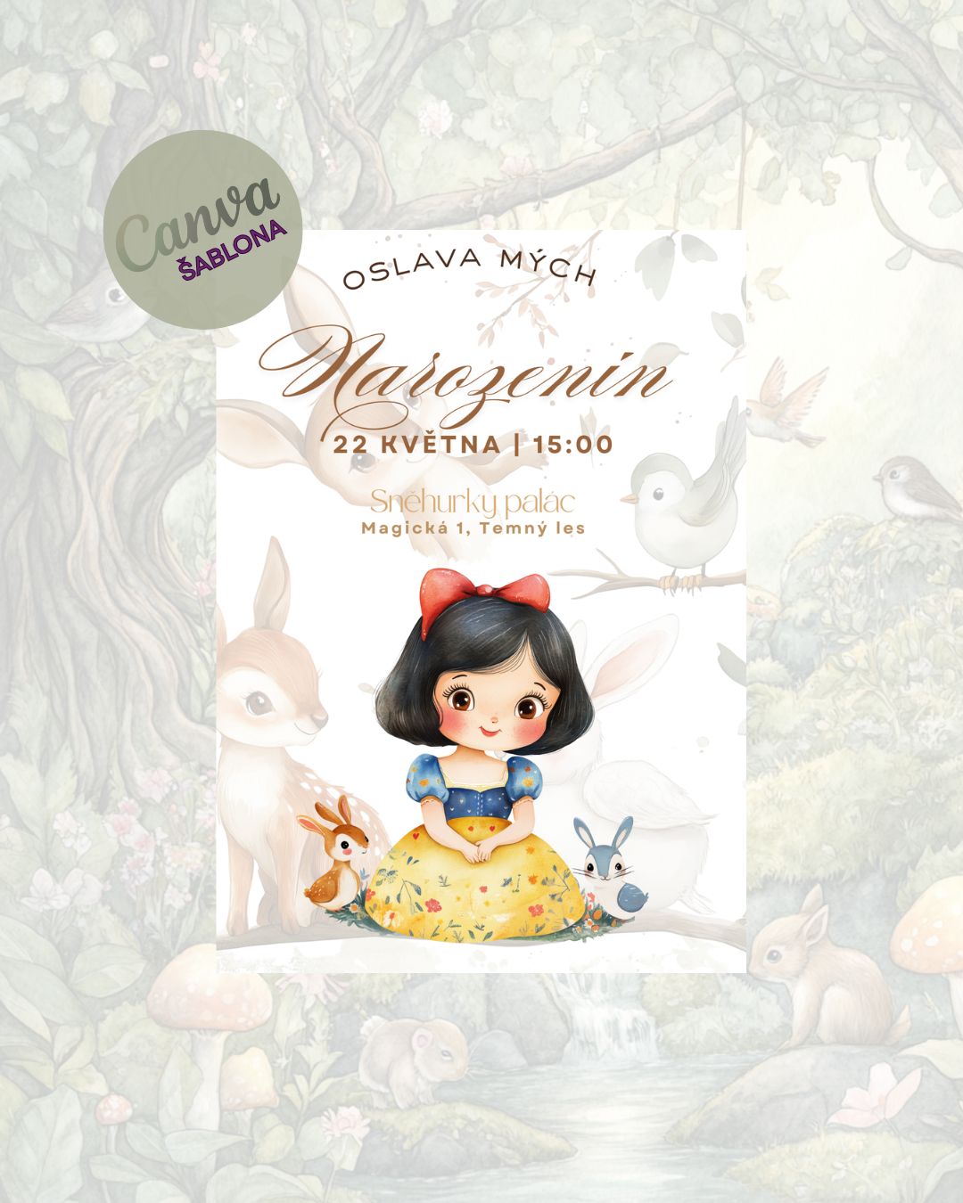 DIGITÁLNÍ šablona narozeninové pozvánky v tématice roztomilé Sněhurky a zvířátek 💖, kterou si sami upravíte v Canvě